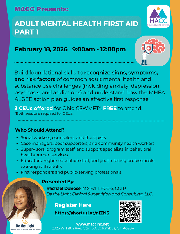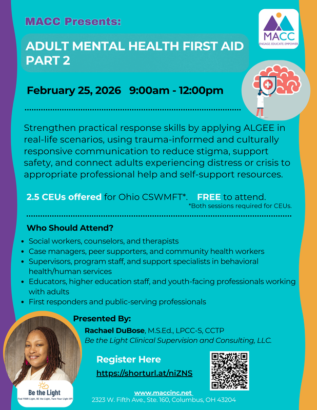 Adult Mental Health First Aid (MHFA) is an evidence-based, nationally recognized training that builds early-intervention skills to support adults (18+) who may be experiencing mental health or substance use challenges. In this session, participants strengthen mental health literacy by learning to recognize warning signs of a developing crisis, reduce stigma, and build confidence to start supportive conversations and encourage next steps.
